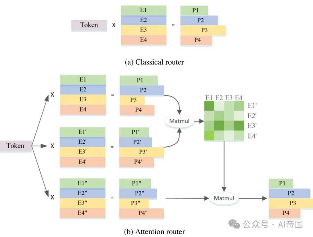 图2(b)展示了本工作提出的注意力路由器的架构,该新颖的路由网络通过采用注意力机制来整合专家间的相关性。构建了一个表示专家间相关性的系数矩阵,并应用于最终概率值的计算中。