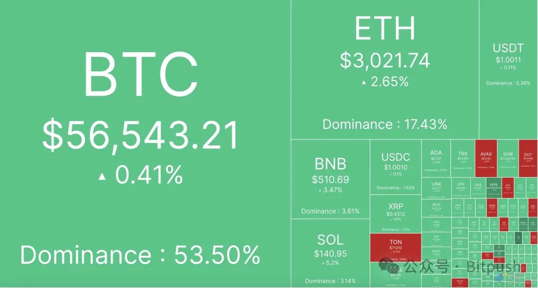 比推数据显示,BTC 在周一下午早些时候触及约 55,200 美元,随后于美股收盘后反弹至56,662.40美元,24 小时涨幅0.58%。