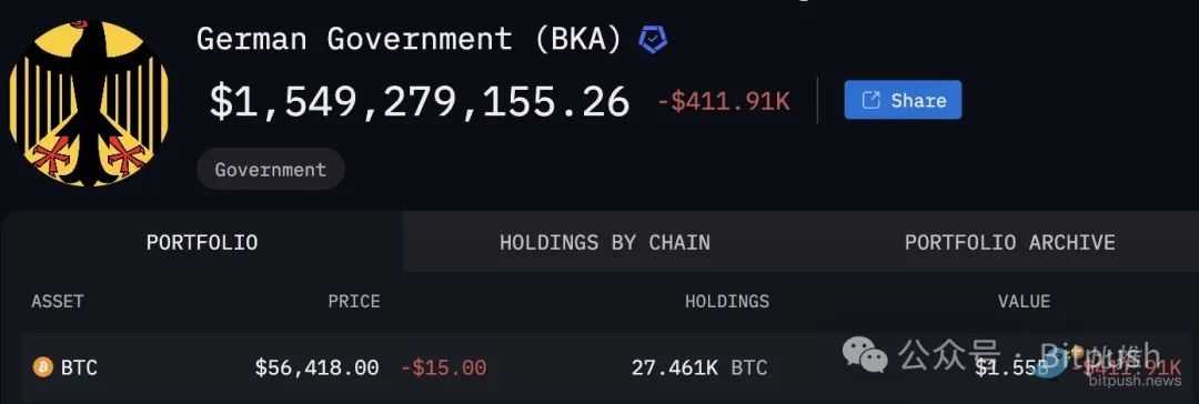 根据 Arkham 的数据,德国政府的抛售进度已完成近一半,自上个月开始抛售以来,其BTC持有量从近 50,000 枚减少至27,461 枚,当前持仓价值 15 亿美元。