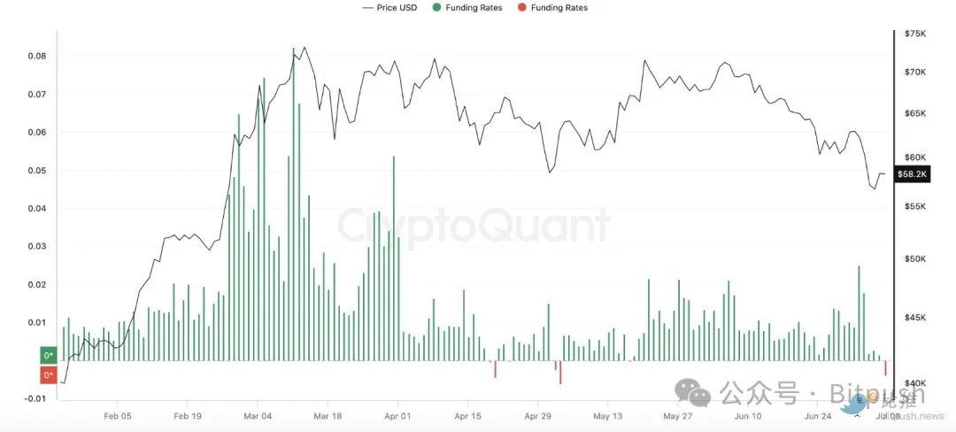 Bitfinex提供的数据显示,自 5 月 1 日触底以来,BTC 永续合约的资金费率首次变为负值。