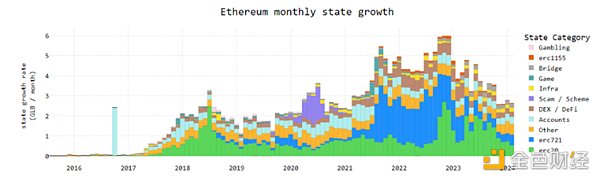 区块链的状态包括账户、各账户余额、nonces 和合约信息。随着交易频繁以及新合约的出现,特别是在像 ETH 这样复杂的系统中,链状态在持续扩展。