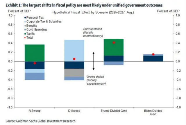 ▲若特朗普获胜,无论是分裂的众议院还是统一的政府,市场认为都将对股市有利,因为这可能意味着美联储会采取更加鸽派的政策。