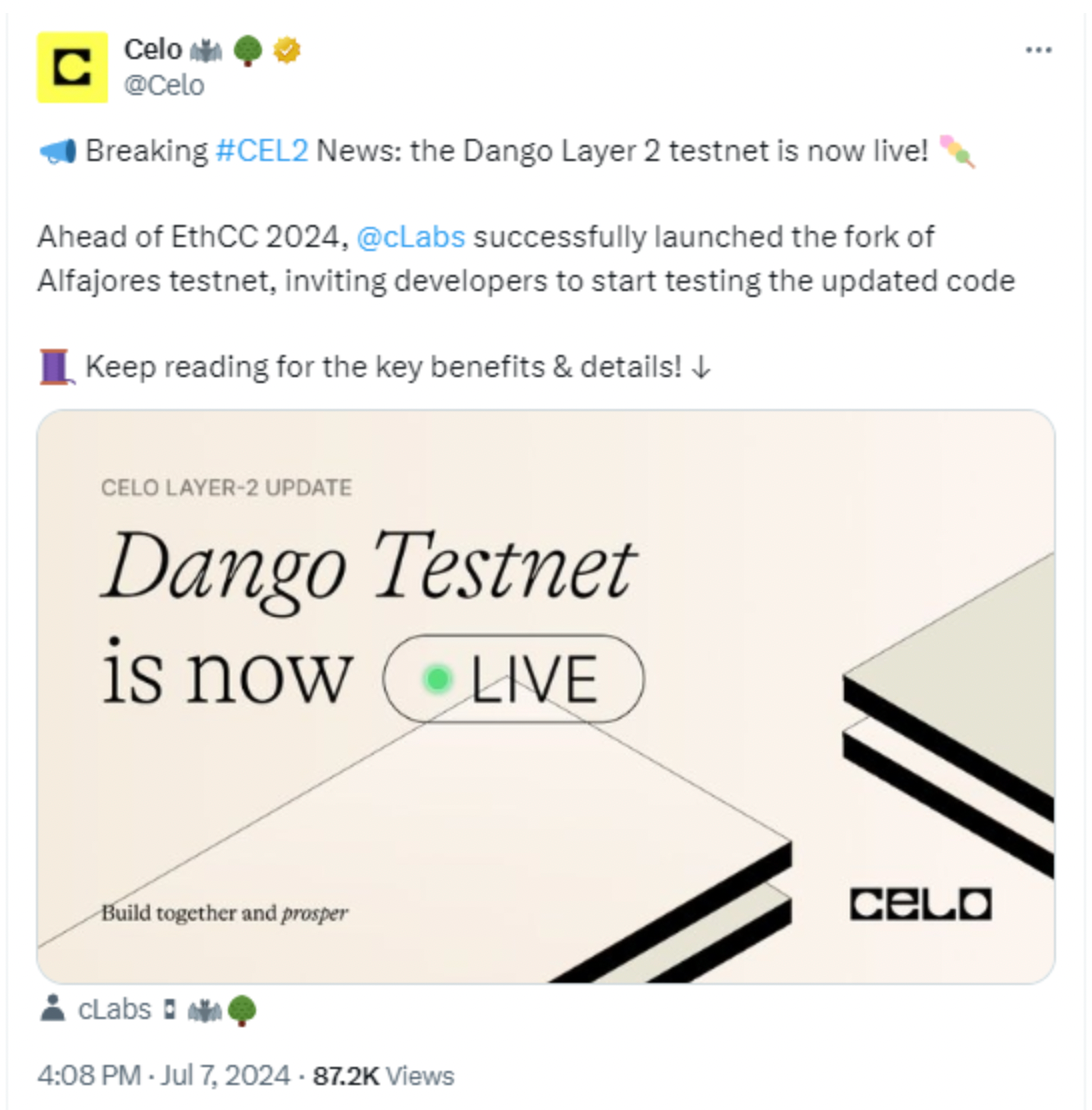 而此次Dango测试网的成功部署不仅是技术进步的体现,也为2024年初冬计划推出的Celo第二层主网打下了坚实的基础。它允许开发人员在不影响面向终端用户服务的情况下,进行广泛的应用测试。随着所有关键基础设施提供商升级其节点代码,Alfajores测试网的升级将无需新的分叉,确保了从测试到主网的无缝过渡。