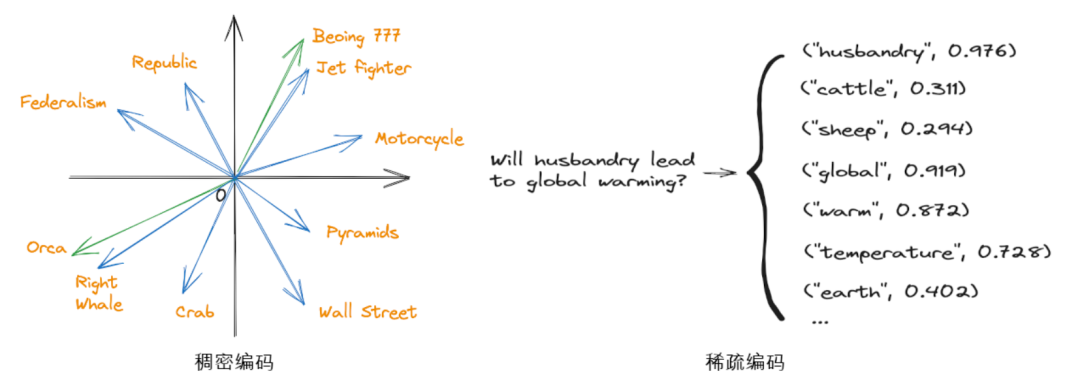 而稀疏编码(Sparse Encoding)则会将文本转化为一组 token 与权值的组合。这里的 token 是语言编码模型采用分割器对文本进行切割后产生的文字单元。例如使用 WordPiece 分割器,token 可以在一定程度上理解为「单词」,但也会出现单词过长而被切分为两个 token 的情况。