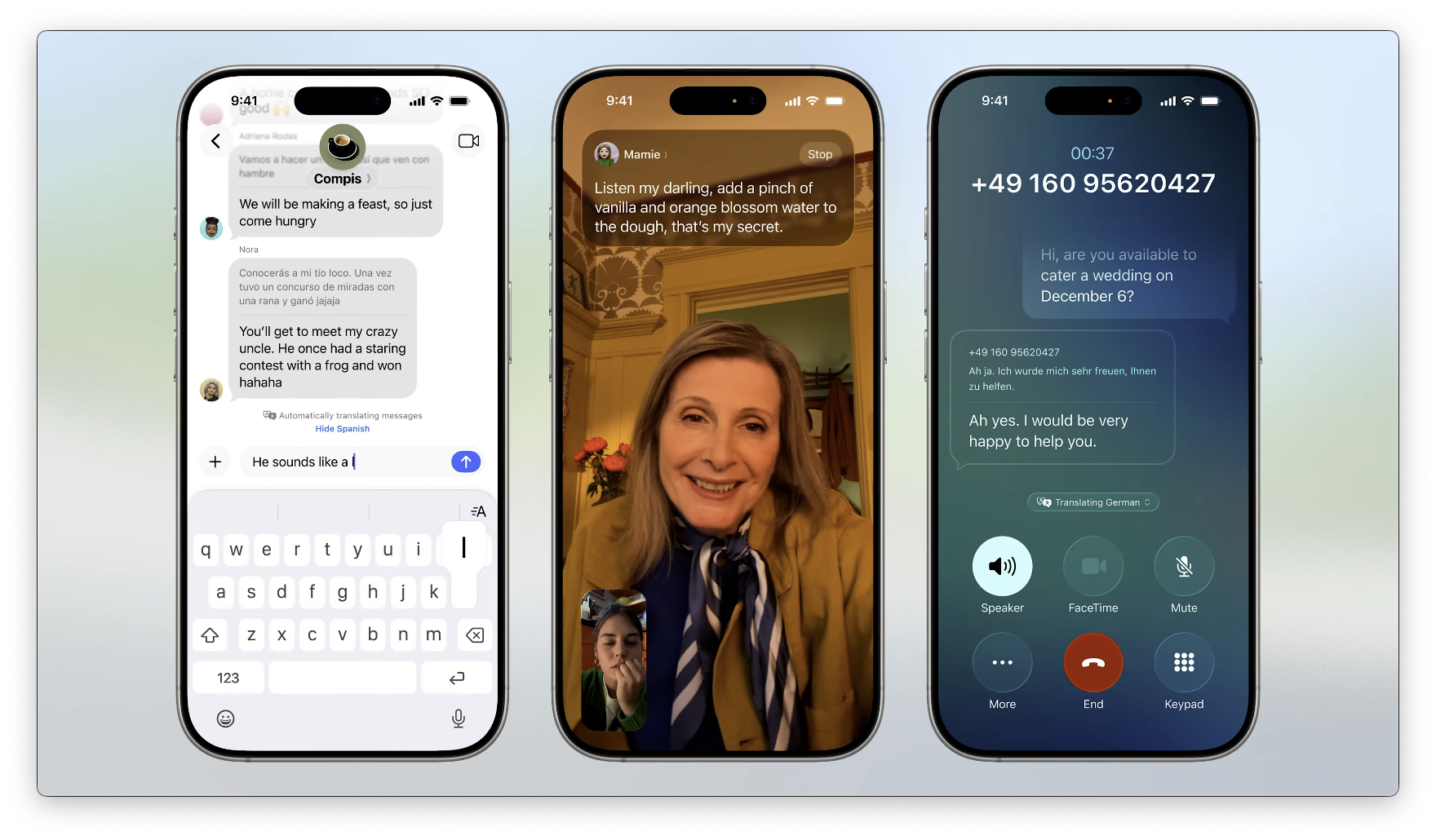 简言之,苹果这次在 AI 策略上选择了回归 WWDC 真正的含义——开发者大会。首先就具体介绍了覆盖苹果全部操作系统的全新翻译功能,支持电话(包括与非苹果设备)、FaceTime、Message 以及苹果音乐等等应用,并且面向开发者推出了新的翻译 API。