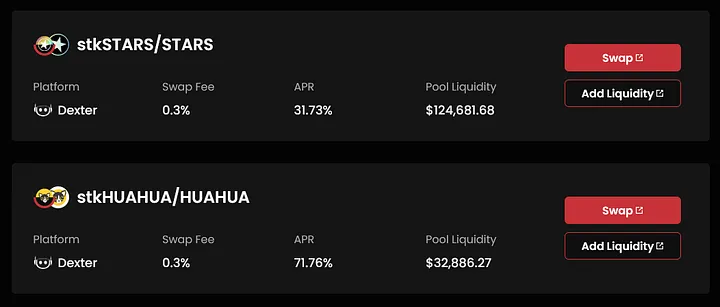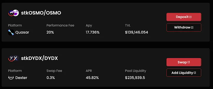 例如,在DEX产品可以直接将stkATOM交换为ATOM,不需要解除质押,也不需要支付1%的费用。而且,stk资产与原生资产组合还可以在DEX中添加流动性,获得更高的收益率。例如,在Persistence旗下的Dexter中,stkDYDX DYDX的预期年化收益率为45.82%。