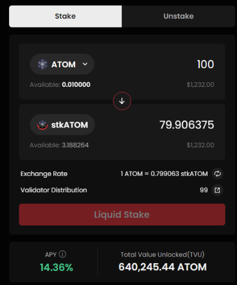 以stkATOM为例,用户每天的质押收益是ATOM,这部分会自动进入质押,继续获得收益。收益进入质押以后,这意味着每一枚stkATOM对应的质押ATOM增加了,用户解除质押时可以获得更多的ATOM。因此,用户的质押收益表现为stkATOM/ATOM的比例增长。
