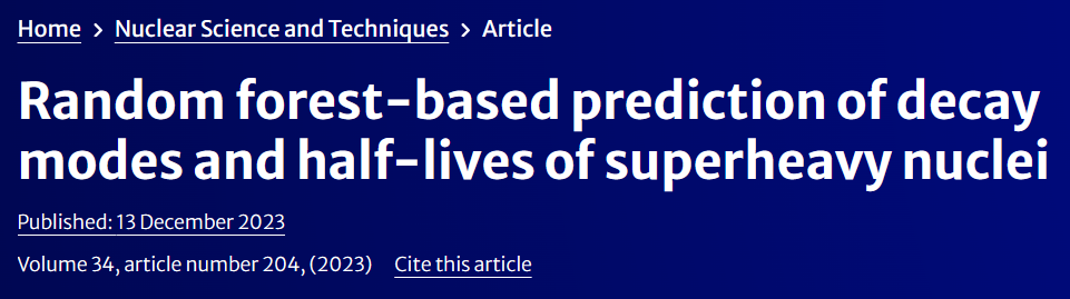 该研究题为《Random forest-based prediction of decay modes and half-lives of superheavy nuclei》,于2023年12月13日在《Nuclear Science and Techniques》杂志上发表。