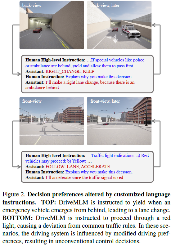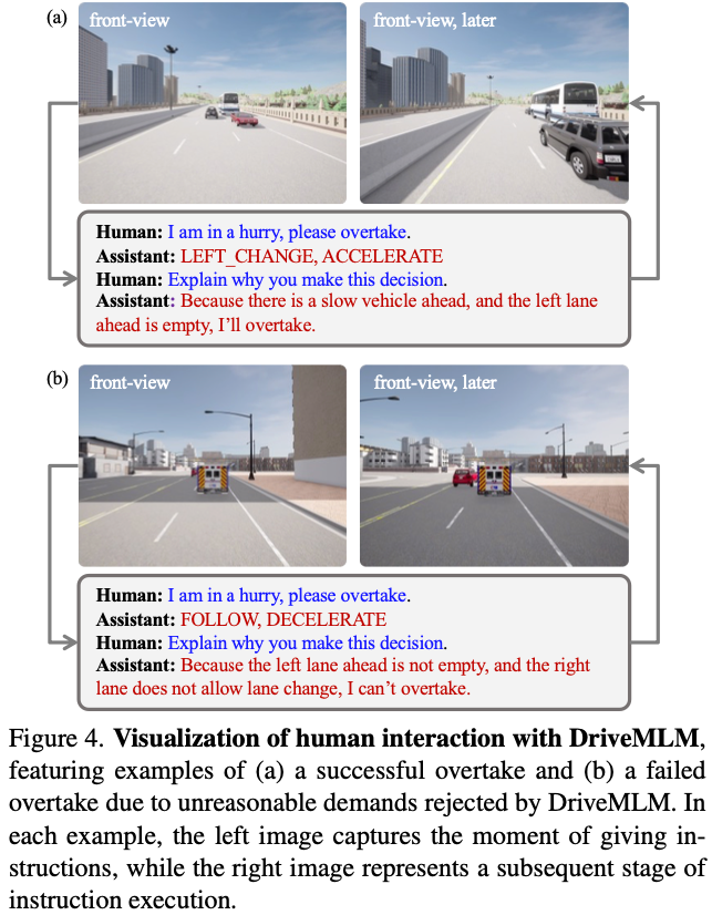 人机交互:图4提供了如何通过人工指令实现车辆控制的示例。控制过程包括分析道路状况、做出决策选择和提供解释性陈述。当给出相同的“超车”指令时,DriveMLM根据对当前交通状况的分析显示出不同的响应。在右侧车道被占用而左侧车道可用的情况下,系统选择从左侧超车。然而,在给定指令可能构成危险的情况下,例如当所有车道都被占用时,DriveMLM会选择不执行超车动作,并做出适当反应。在这种情况下,DriveMLM是人车交互的接口,它根据交通动态评估指令的合理性,并确保其在最终选择行动方案之前符合预定义的规则。