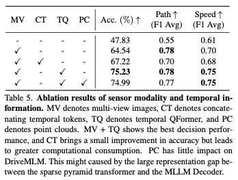 传感器模态:表5展示了输入传感器模态对DriveMLM的不同影响的结果。多视图(MV)图像在路径和速度F1得分方面都带来了显著的性能改进,准确率提高了18.19%。与直接连接时间令牌相比,时间QFormer在确保多模态决策能力的同时,实现了7.4%的更大改进,从而使速度决策的平均F1得分提高了0.05。点云不会显示出增强性能的能力。