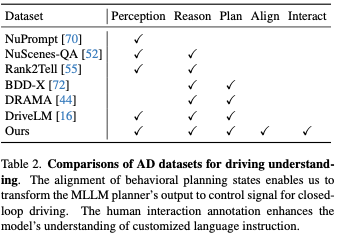 表2展示了与之前为使用自然语言进行驾驶理解而设计的数据集的比较。我们的数据有两个独特的特点。第一个是行为规划状态的一致性。这使我们能够将MLLM规划器的输出转换为控制信号,以便我们的框架能够在闭环驾驶中控制车辆。二是人际互动标注。它的特点是人类给出的自然语言指令以及相应的决定和解释。目标是提高理解人类指令并做出相应反应的能力。