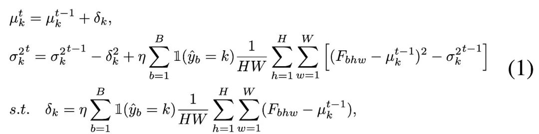 为了纠正不平衡测试数据对 BN 统计量产生的估计偏置,作者提出了一个平衡批归一化层,该层为每个语义类分别维护了一对统计量,表示为: