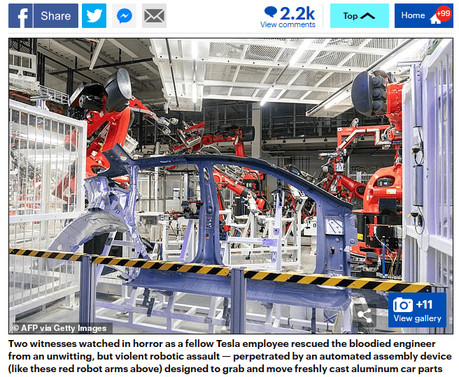 据英国《每日邮报》26日报道,特斯拉在美国得克萨斯州奥斯汀的超级工厂发生了一起“血腥”的事故。在这起事故中,一名特斯拉工程师遭到了机器人的攻击。这起事故发生在特斯拉的超级工厂,造成了严重的后果。工程师受到机器人的攻击,导致受伤严重。这起事件引发了人们对机器人安全性的关注。特斯拉目前正在调查事故的原因,并采取措施确保类似事件不再发生。