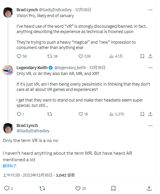 在他与网友的互动中,他透露苹果公司只禁止使用虚拟现实(VR)这个词,而不禁止使用增强现实(AR)和扩展现实(XR)。然而,在岗前培训中几乎没有提到混合现实(MR)
