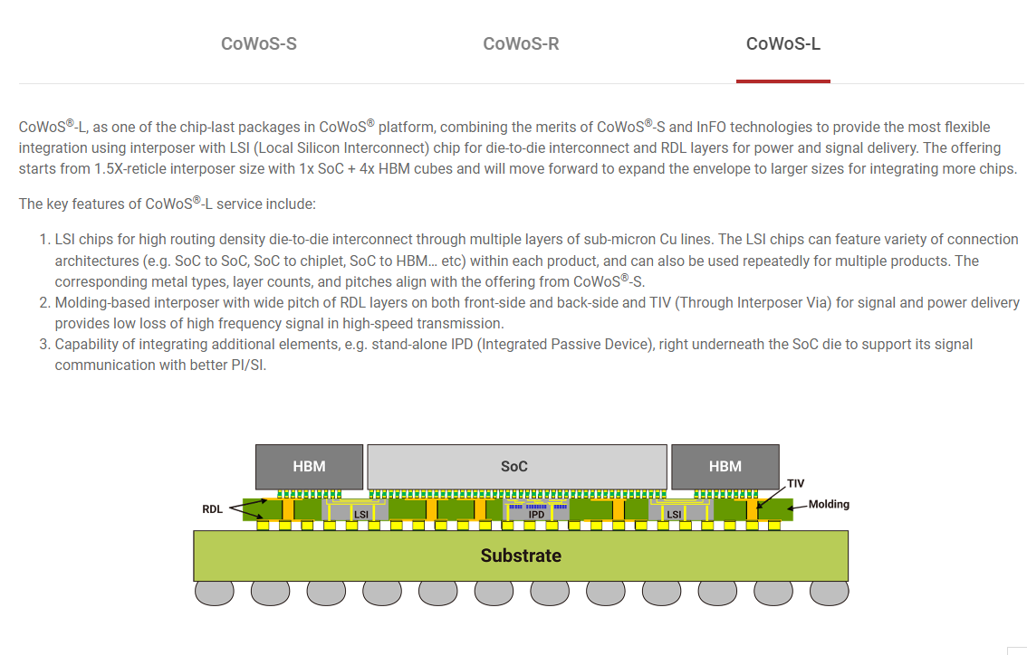 本站查询发现,当前CoWoS先进封装技术主要分为三种——CoWos-S、CoWoS-R、CoWoS-L,其中CoWoS-L是最新技术之一。CoWoS-L结合了CoWoS-S和InFO技术的优点,采用中介层与LSI(本地硅互连)芯片提供灵活的集成方案,可应用于芯片到芯片的集成