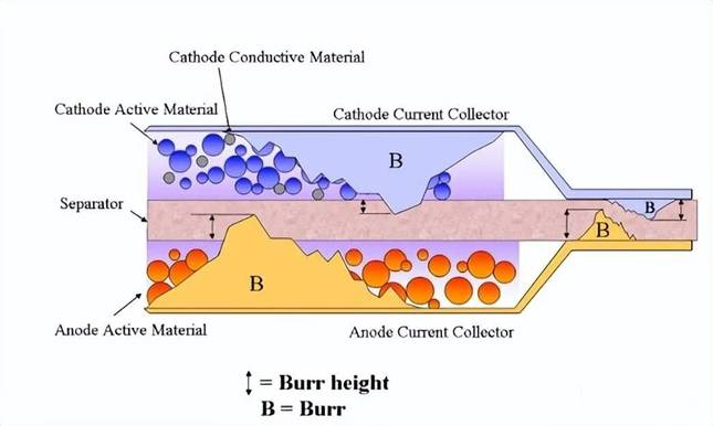毛刺过大容易刺穿隔膜,进而正负极接触引发短路。如果电池处于满电状态时发生短路,内部会立即释放出大量热量造成爆炸,严重危及消费者的生命财产安全。