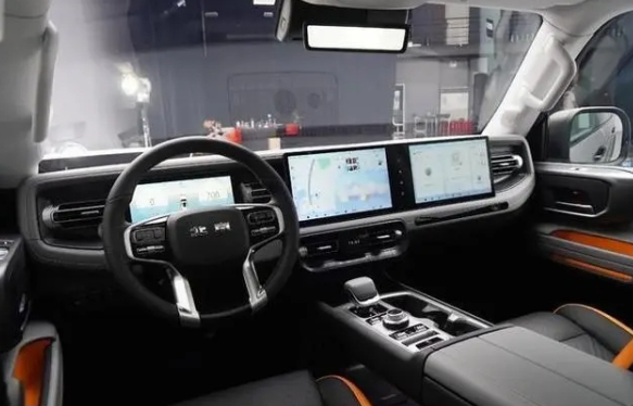 在内饰方面,全新一代北京BJ40采用了城市型SUV风格的设计,车内更多地采用皮质包覆,配置了中控屏和新增的副驾驶屏,形成双连屏设计,提供更便捷的信息娱乐和导航功能。此外,新车还保留了A柱和B柱的车内扶手,并采用了电子式挡杆设计,提升驾驶体验