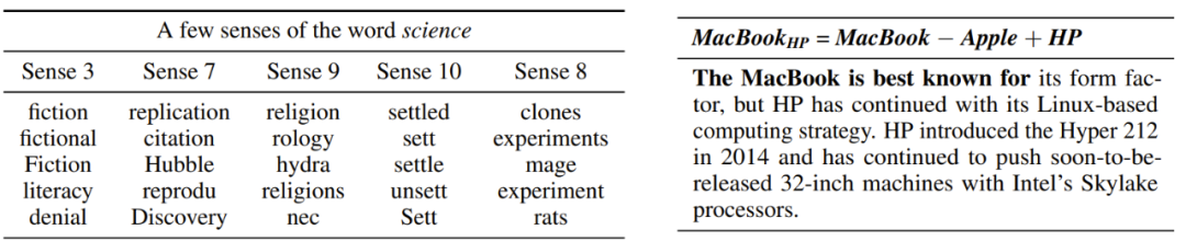 表 1:左侧是表示 science 一词的意义向量示例,其中具有丰富的特定领域指向;右侧是以非上下文的方式编辑意义向量的示例(将 MacBook 变得与惠普相关),从而改变了所得的上下文预测。