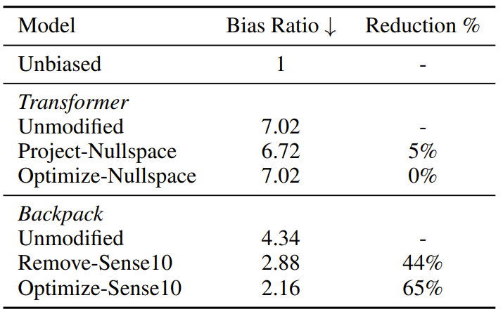 研究者发现,许多职业名词(比如护士、CEO、教师)的意义向量 10 都带有性别的刻板印象,并且这种刻板印象会通过代词连贯地表达出来。通过调降意义 10(乘以小于 1 的标量),研究者发现可以降低 Backpack 在这些职业名词上的性别偏见。