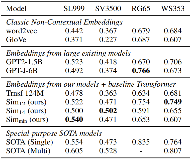 从下表 4 可以看到,意义 12(同义词意义)在所有数据集上都表现良好,媲美或者优于 GPT-2-1.5B 和 GPT-J-6B 等嵌入,而 GPT-J-6B 在 RG-65 上则例外。意义 14 是动词宾语意义,仅在动词相似度(VerbSim3500)上表现好,而意义的最小相似性在名词词汇相似性上表现尤其出色 (SimLex999)。这说明新提出的方法足以比肩当前最优的方法,尽管它们的训练任务非常不同,意义向量编码了大量的词汇信息。
