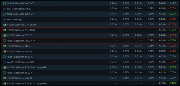 9月8日消息,根据最新数据显示,英伟达的全新GeForce RTX 4060显卡已在8月份首次现身Steam平台,其份额为0.23%。尽管这一数字看似不高,但令人意外的是,与7个月前发布的Radeon RX 7900 XTX显卡相比,这两者的份额竟然相同。