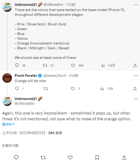 8月22日消息,今天消息源Unknownz21发布了一条引人瞩目的推文,曝光了即将发布的iPhone 15和iPhone 15 Plus两款机型的全新颜色选择。据称,苹果计划在新一代iPhone 15标准版中推出6种引人注目的颜色,然而,这些颜色目前仍在内部调整中,尚无法完全确定。报道中特别强调了两种颜色,即接近于2018年iPhone XR的“珊瑚色”的橙色,以及全新的粉色