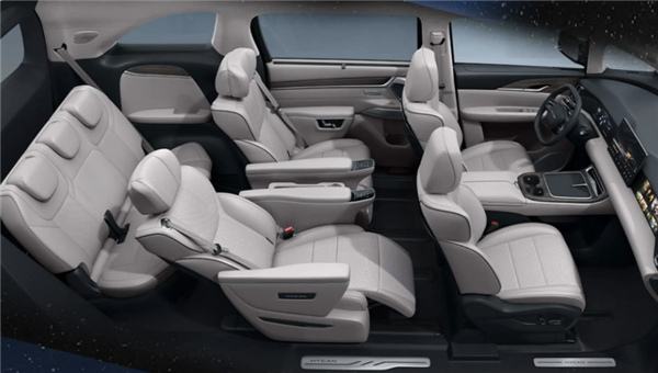 合创V09是一款MPV车型,它采用了7座布局,第二排配备了独立的航空座椅,并配备了航空头枕和腿托等配置。据传,这款新车还可能配备了17.3英寸的后排大屏幕,并配置了车载冰箱和三区独立空调等豪华配置