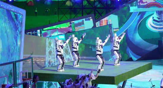 在Walker X拉开序幕后,4台熊猫机器人优悠以人机共融的舞蹈与乐队和50多名舞蹈演员一同登场,演绎了一段关于未来的篇章。其中,熊猫机器人优悠从一个十岁小男孩手中接过象征未来的风车,并手持自拍杆,像一位大运拍客一样,将闭幕式的盛况通过直播传递给全世界的观众