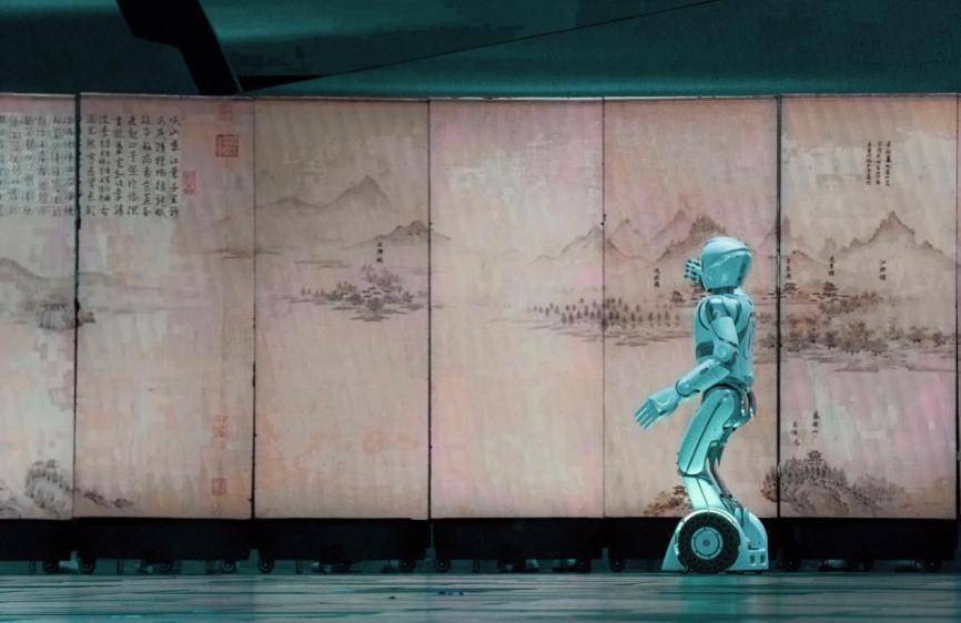 优必选的大型人形机器人Walker X与《蜀川胜概图》进行互动,骑着平衡车
