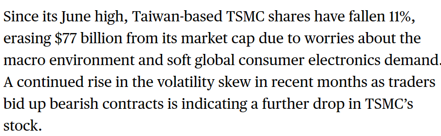 ▲ 图源 彭博社 而出于对全球宏观环境的担忧,台积电股价自 6 月高点下跌 11%,市值蒸发 770 亿美元(当前约 5628.7 亿元人民币)。近几个月波动率偏斜持续上升,从而导致台积电后续股价还将进一步下跌。