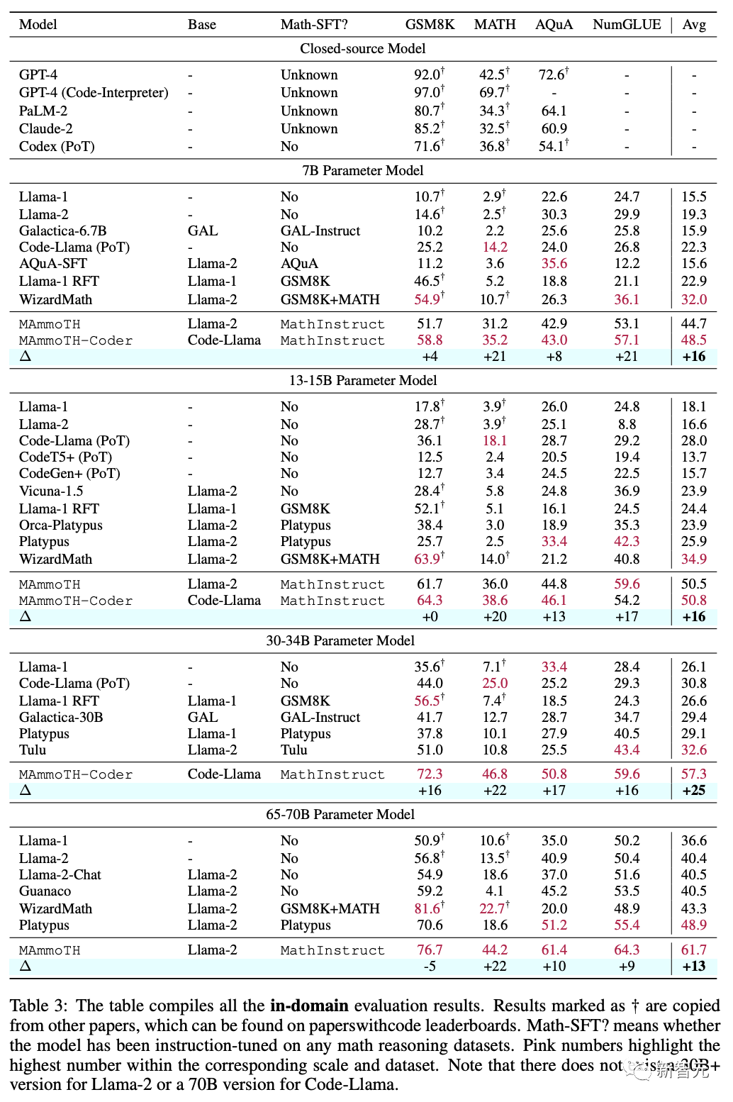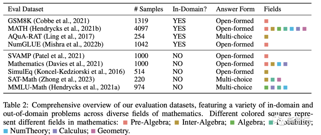 领域内数据集包括GSM8K,MATH,AQuA-RAT,NumGLUE;领域外数据集包括SVAMP,Mathematics,SimulEq,SAT-Math和SimulEq,涵盖了小学、高中和大学水平的数学问题,部分数据集甚至包括形式逻辑和常识推理。