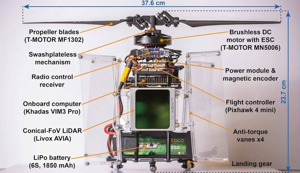 张博士的团队发现“脉冲星 ”与具有相同桨叶面积和载荷的四旋翼无人机相比,它能够节省26.7%的能量消耗,同时保持良好的灵活性。由于使用了单执行器,脉冲星的动力系统具备了更高的能量转化效率,使整体效率达到了每瓦6.65克。仅凭借直径只有37.6厘米的螺旋桨和容量为41瓦时的小容量电池,这个重达1234克的无人机实现了超过12分钟的悬停时间。如果卸下激光雷达并安装更大的桨叶和电池,“脉冲星 ”的悬停时间更能超过40分钟。