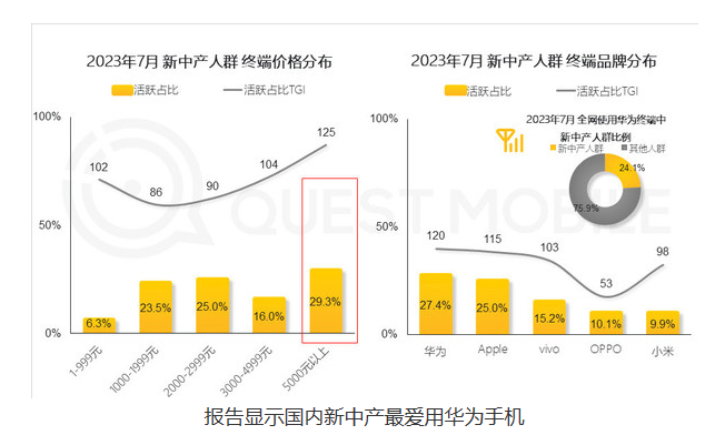 根据QuestMobile发布的报告,新中产人群对高端手机的偏好有着明显的差异。其中,有近三成的新中产人群选择了华为手机,这一比例接近30%。而苹果手机也备受欢迎,有25%的新中产人群使用苹果手机。其次是vivo,占比为15.2%,表明vivo在高端市场也取得了一定的份额。这些数据清晰地表明,高端手机市场对于新中产人群来说,已经成为一项重要的消费选择。