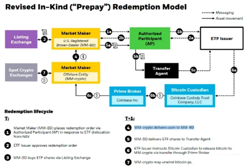 根据修订后的模式,AP 将现金转移给经纪交易商,经纪交易商随后将现金转换为比特币,然后由 ETF 的托管提供商(贝莱德案例中的 Coinbase Custody)存储。