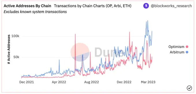 除了公链收入以外,我们再来看看Arbitrum上的每日交易笔数与活跃地址数的对比,如下Dune面板所示,过去三个月里Arbitrum生态中的交易笔数远大于Optimism,Arbitrum上的交易笔数约为OP的2-3x,其中有其生态中的爆火游戏Beacon的影响,也有GMX这类Top级协议的带动。