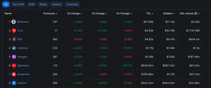 从下图Defillama的排行中我们可以看出,目前Arbitrum上的协议数量为234个,Optimism上的为113个,是OP生态的两倍,过去一个月两者的TVL都上涨了近20%,没有显著差别;而从TVL来看,Arbitrium上的TVL目前为$1.71b,OP为$0.94B,前者是后者的1.82倍。