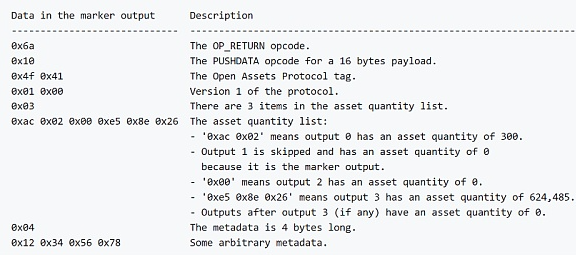 2013年底,Flavien Charlon提出Open Assets Protocol,作为染色币的一种实现。资产发行者利用非对称密码学计算资产ID,保证只有持有资产ID私钥的用户才能发行相同的资产。对于资产的元数据,利用OP_RETURN操作码存储到脚本中,称元数据为marker output,在不污染UTXO的前提下存储了染色信息。由于利用了比特币的公私钥密码学工具,资产发行可以由多签进行。